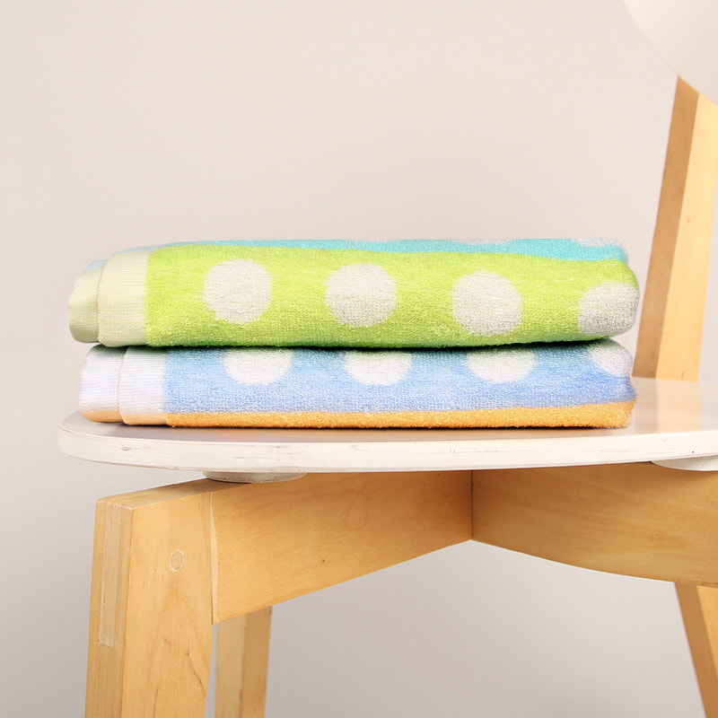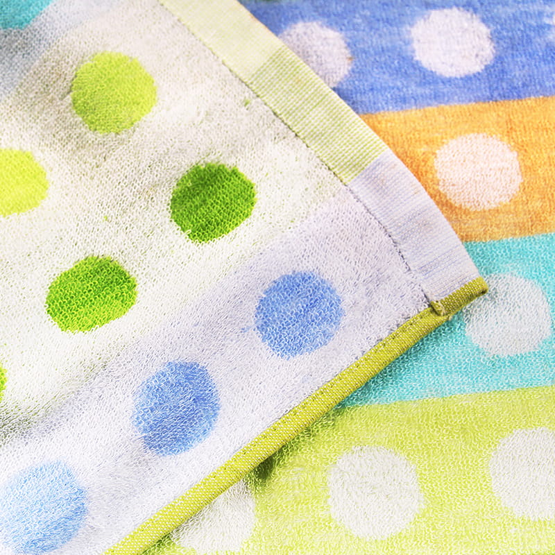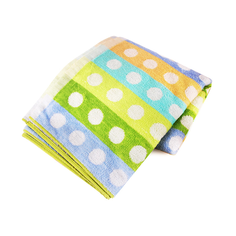 Denna polka dot bomullsbadhandduk är gjord med en tredimensionell jacquardprocess med dubbla färg, som har en mjuk och fluffig känsla och kan också användas som filt.